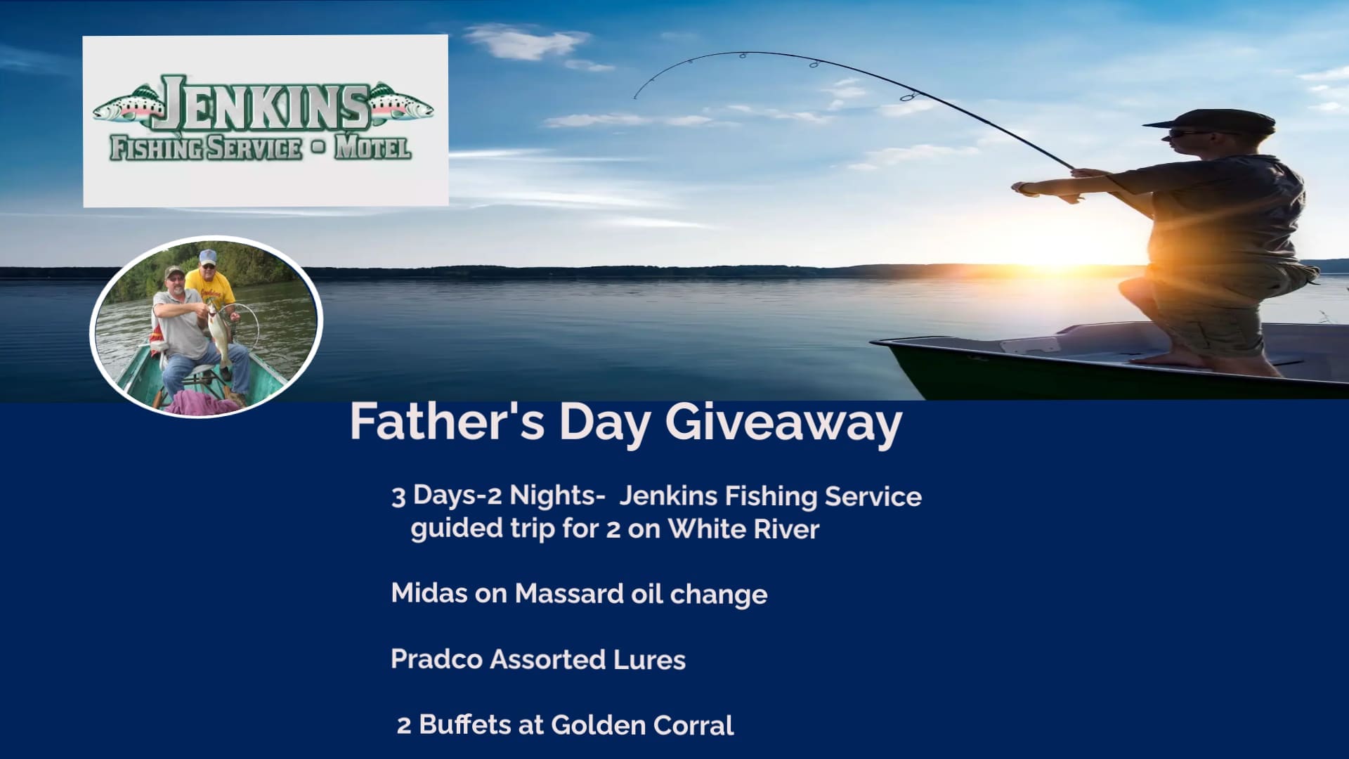 The second Prize includes a 3-day, 2-night Guided Trip for 2 on the White River from Jenkins Fishing Service, Assorted Lures from Pradco, an Oil Change from Midas on Massard, and 2 buffets from Golden Corral.